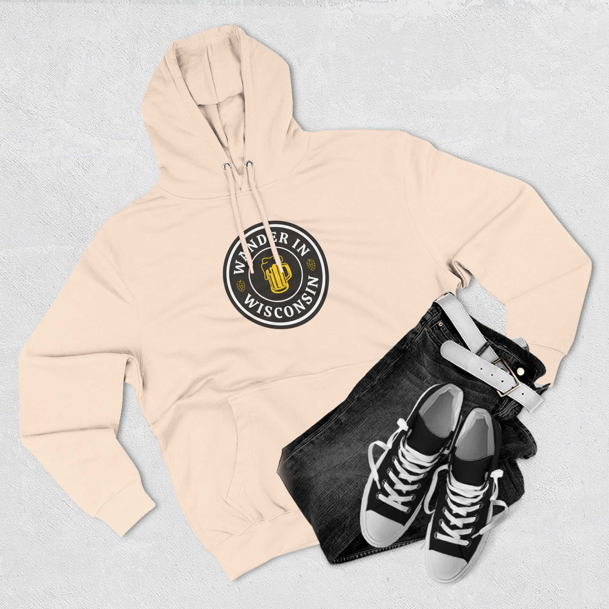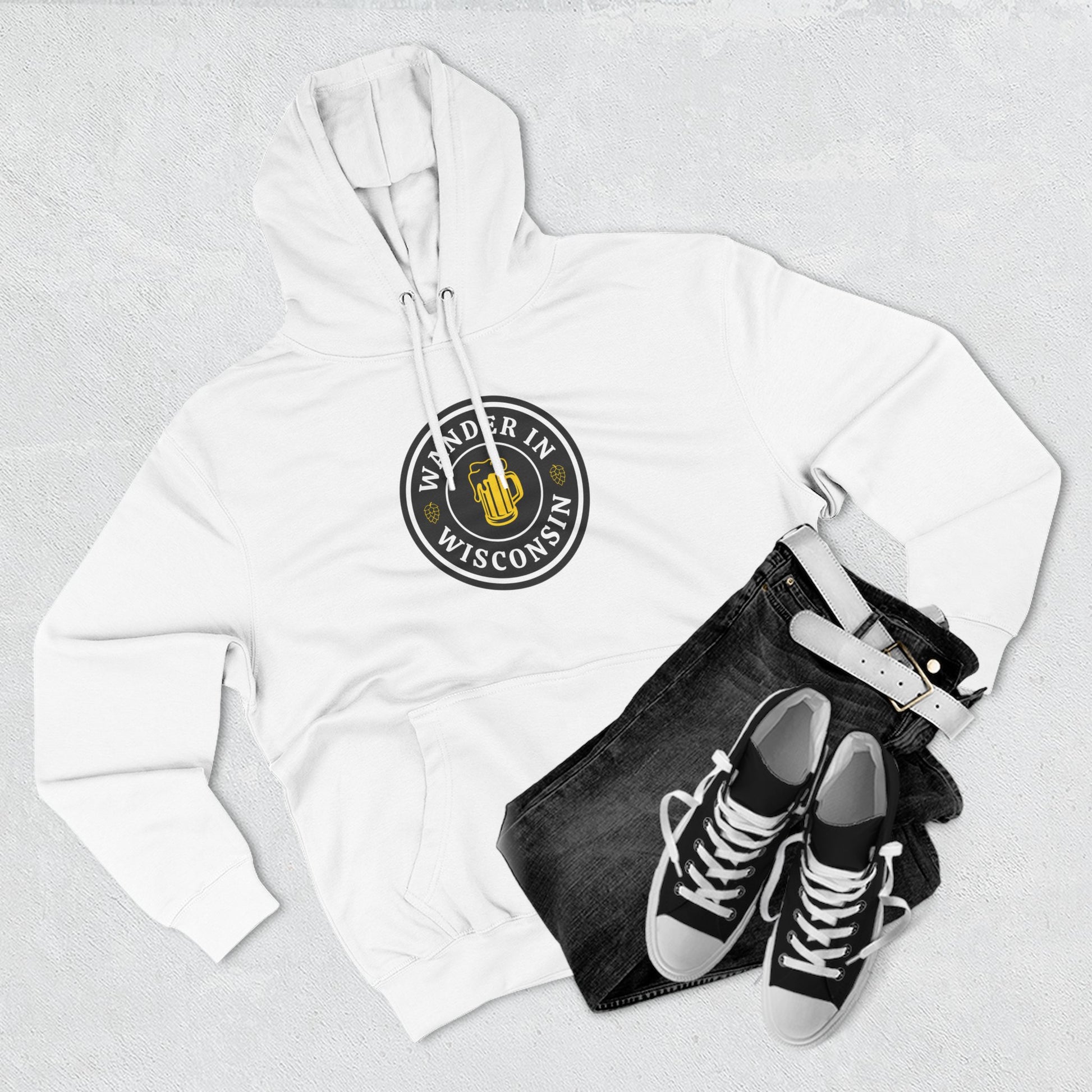 The Original Wander in Wisconsin Hoodie. Experience comfort and style with this cozy fleece hoodie. Designed for those who appreciate both fashion and functionality, it features an adjustable hood with drawstrings that offers a snug fit and a spacious kangaroo pocket to keep your hands warm. The soft fabric is gentle against the skin, making it perfect for everyday wear or lounging at home. This hoodie adds a relaxed vibe to any outfit, making it ideal for casual outings or cozy nights in. It’s perfect for anyone who loves casual comfort, whether you're a student, a busy parent, or a homebody. Great for colder seasons, it also makes a thoughtful gift for birthdays, holidays, or just to brighten someone’s day. Embrace comfort and style this winter with this essential piece!